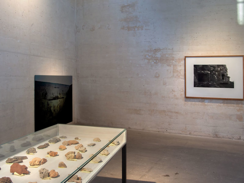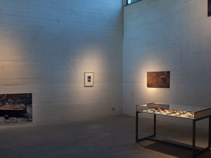 Placa de cobre, grabado sobre papel y vitrina con piedras de búnker.